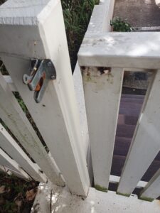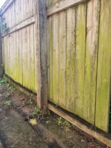 ![]() | Fence about to topple, notice the post completely rotted out at the bottom (a bit hard to see but there was nothing left). This is quite common at the ground line where water pools and dries over and over. The fence post was removed and replaced with 100×75 H3 treated fence post. The rest of the fence was straightened and made tidy. |