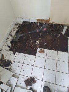 ![]() | Water damaged sub-floor underneath some poorly laid tiles in a laundry. The whole floor was removed and rebuilt and covered with waterproof lino by a 3rd party floor covering contractor. |