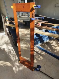 ![]() | A broken mirror door frame from an antique silky oak wardrobe cabinet. This needed high strength wood glue and dowel pins to bring it back into square and aligned correctly with the glass. |