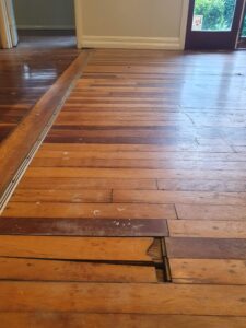 ![]() | Tongue and groove flooring in a bad way. The original installation of this floor was appalling, so it needed a lot of repair. Finally, it was sanded and finished by professional floor polishers. |
