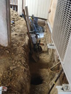 ![]() | A drainage trench was required to save a downstairs bedroom from regular flooding from the ground water around it – generally after each rain event. A concrete sleeper wall was installed to hold the earth in place. |