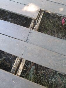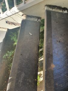 ![]() | Hardwood stair treads that have rotted at the ends and lost contact with the side stringer. These were all replaced with treated hardwood treads and grip-tape. |